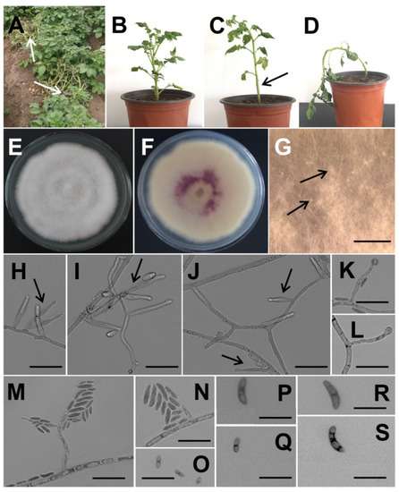 Figure 1. Morphological characteristics of the mycelium and spores of F. foetens and its pathogenicity. (A) The potato plants with wilt symptoms in the field. (B) Negative control: the potato seedlings in pots inoculated with sterilized water and cultivated in the greenhouse. (C,D) the potato seedings after infection with F. foetens for 4 to 6 and 9 days, respectively. (E,F) The front and the reverse colony of the F. foetens on PDA, cultured at 25 °C and for 7 days. (G) The dotted appearance formed on aerial mycelia, the scale bar is 5 μm. (HJ) The phialides of the mycelium, the scale bar is 20 μm. (K,L), The chlamydospore, the scale bar is 20 μm. (MS) The microconidia, the scale bar is 20 μm.