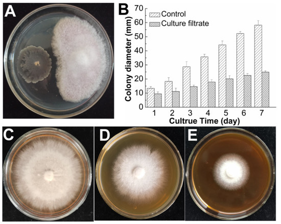 Figure 2. The antifungal activity of B. subtilis SF1 against F. foetens in vitro. (A) The confrontation assay of B. subtilis SF1 and F. foetens on PDA. (B) The colony diameter of F. foetens on PDA with and without B. subtilis SF1 culture filtrate. (CE) The colony of F. foetens on PDA supplemented with different volumes of culture filtrate, the volume ratio of culture filtrate to water was 0:5, 2:3, and 5:0, respectively.