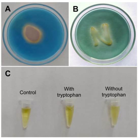 Figure 4. The plant growth-promoting determinants produced by B. subtilis SF1. (A) The siderophores production on CAS agar. (B) The organophosphorus solubilization assay on NBRIP. (C) The IAA production in LB with or without Tryptophan.