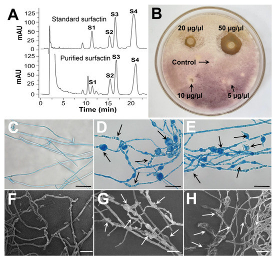 Figure 5. The HPLC fingerprint spectrum of surfactin produced by B. subtilis SF1 and its effects on the mycelium growth and morphology of F. foetens. (A) HPLC analysis of standard surfactin and the purified surfactin from B. subtilis SF1. (B) The antifungal activity of surfactin against F. feotens in vitro. (C,F) F. foetens mycelium without surfactin treatment under positive fluorescent microscopy and SEM. (D,E) Surfactin-treated F. foetens mycelium under positive fluorescent microscopy. (G,H) Surfactin-treated F. foetens mycelium under SEM.