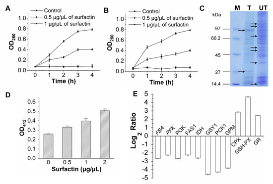 Figure 6. The effects of surfactin on the proteins, nucleic acids, GSH production, and gene transcription levels of F. foetens. (A) The effect of surfactin on the extracellular OD260. (B) The effect of surfactin on the extracellular DO280. (C) The effect of surfactin on the protein expression. (D) The effect of surfactin on GSH production. (E) The transcription levels of genes in F. foetens under surfactin treatment. FBA encodes fructose-bisphosphate aldolase; PFK encodes phosphofructokinase; PGK encodes phosphoglycerate kinase; FAS1 encodes fatty acid synthase subunit beta; IDH encodes isocitrate dehydrogenase; GSY1 encodes glycogen synthase; PCK1 encodes phosphoenolpyruvate carboxykinase; GPM encodes phosphoglycerate mutase; CPX encodes catalase-peroxidase; GSH-PX encodes glutathione peroxidase; GR encodes glutathione reductase.