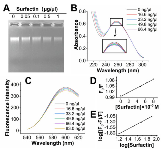 Figure 7. The interaction between surfactin and the genomic DNA of F. foetens. (A) Gel retardation assay after surfactin mixed with the DNA. (B) UV-Visible absorption spectra of F. foetens DNA with increasing concentrations of surfactin in PBS buffer (pH = 7.2). (C) The effect of surfactin on the fluorescence emission of ff-DNA-EB complex (λex = 485 nm). (D) The Stern-Volmer plot of surfactin quenching effect on ff-DNA-EB complex fluorescence at room temperature. (E) The double-log plot of surfactin quenching effect on ff-DNA-EB complex fluorescence at room temperature.