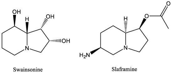 - Broquist, H. The indolizidine alkaloids, slaframine and swainsonine: Contaminants in animal forages. Annu. Rev. Nutr. 1985, 5, 391e409. [Google Scholar] [CrossRef]