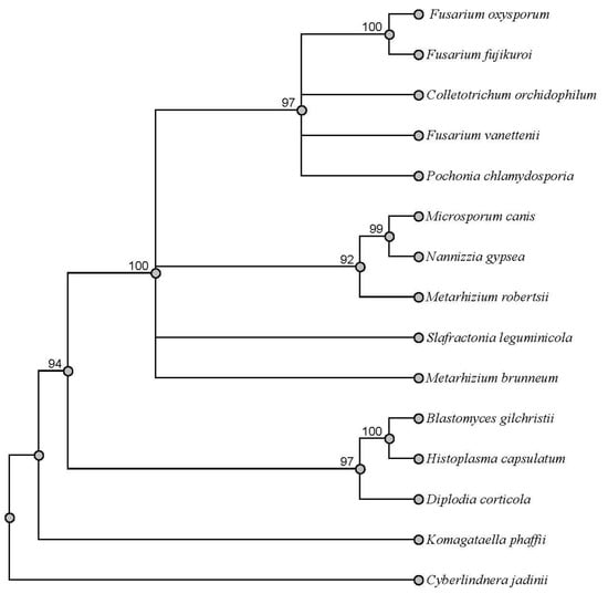 SwnT and SwnT-like protein sequences of Slafractonia leguminicola, Fusarium vanettenii, Fusarium oxysporum, Fusarium fujikuroi, Colletotrichum orchidophilum, Metarhizium robertsii, Metarhizium brunneum, Microsporum canis, Blastomyces gilchristii, Pochonia chlamydosporia, Nannizzia gypsea, Cyberlindnera jadinii, Komagataella phaffii, Histoplasma capsulatum, and Diplodia corticola were obtained from the protein blast program of NCBI. Sequences of each protein were added to fasta files and compared with Geneious Prime 2023. The sequences were grouped in a multiple alignment and aligned with MUSCLE alignment (the standard muscle algorithm). The alignment of the 15 sequences produced was selected to build the tree using PAUP* plugin following the maximum parsimony algorithm, heuristic tree search strategy, and bootstrapping (fixed seeds 100, 1000 replications, and FastStep search type). Cyberlindnera jadinii was used as the outgroup.