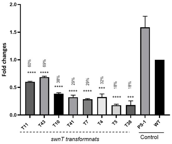 Reverse transcription quantitative PCR (RT-qPCR) analysis of total RNA of WT and swnT-silencing transformants. Target swnT gene expression was normalized to the expression pattern of fungal internal control gene RDN5.8. WT: wild-type S. leguminicola, PS-1: S. leguminicola transformed with empty vector (pSilent-1), pSilent-swnT transformants (T10, T41, T7, T5, T11, T43, T38 & T4) growing on PDA for four days after transformation with the silencing construct pSilent-swnT. Fold change is normalized to WT, and percentages represent percentage of swnT expression relative to WT. Error bars represent the ± SEM (n = 3), p values are calculated using unpaired Student’s t test compared with WT ( *** p < 0.001, **** p < 0.0001, ns = not significant p > 0.05).