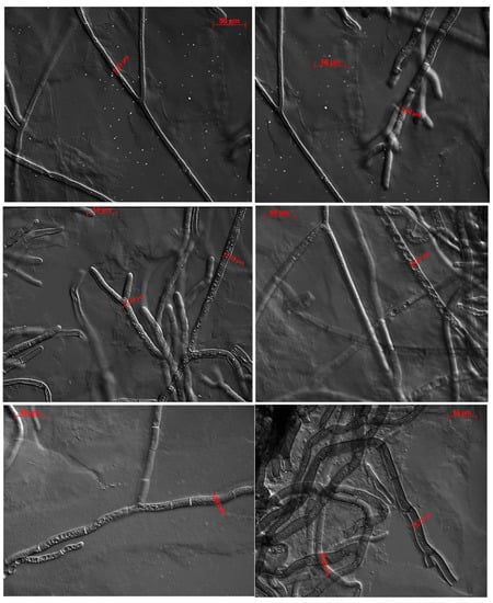 Transformants with about 82% silencing of swnT (T5 and T38) showed very poor mycelial growth and a slower growth rate than the WT. Some transformants with higher levels of swnT silencing were not able to survive, while the transformants with about 60% silencing of swnT appeared to have a normal growth pattern similar to that of the WT. Differences were observed in hyphal structure between the transformants and the control (Figure 4).The swnT-silenced transformants showed wide, stunted hyphae, whereas the WT showed long, thin hyphae. The width of the hyphae of the swnT transformants (T5 and T38 with 82% silencing) ranged from 18.0 μm to 29.5 μm, with an average of 22.2 μm, whereas the width of the hyphae of the WT ranged from 5.2 μm to 8.2 μm, with an average of 7.1 μm. The transformants with a moderate level of silencing (T10, T4 with 62–71% silencing) showed hyphal width ranging from 7.1 μm to 13.2 μm.