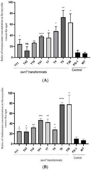 Biochemical analysis of (A) swainsonine and (B) slaframine (LC–MS) in the pSilent-swnT transformants. Data are expressed as ratios of the (A) swainsonine and (B) slaframine concentrations in the mycelia versus the agar between the pSilent-swnT transformants, PS-1 S. leguminicola transformed with empty vector (pSilent-1), and WT S. leguminicola. Significant differences in the ratios were observed between the transformants and the controls. Transformants T5 and T38 showed the highest ratio compared with the control. Error bars represent the ± SEM (n = 3), p values are calculated using unpaired Student’s t test compared with WT (* p ≤ 0.05, ** p < 0.01, *** p < 0.001, **** p < 0.0001, ns = not significant p > 0.05).