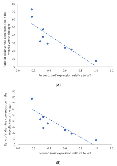 Pearson correlation between percentage of swnT expression relative to WT and ratio of (A) swainsonine and (B) slaframine concentration in the mycelia versus the agar in the pSilent-swnT transformants and WT. Correlation coefficient was used to determine the relationship between swnT gene expression and the ratio of (A) swainsonine (r = −0.86) and (B) slaframine (r = −0.85) concentrations in the mycelia versus the agar.