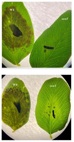 Detached red clover leaves infected with the WT and the T5 pSilent-swnT transformants (4 dpi) (black marks on the leaves were drawn on the leaf at time of inoculation for a point of reference). Detached red clover leaves were inoculated with the T5 swnT transformant and WT five-day-old cultures of S. leguminicola. On day 4 post-inoculation, the leaves inoculated with WT S. leguminicola showed black patch lesions covering almost the entire leaves, while the leaves inoculated with T5 pSilent-swnT transformants showed very few lesions.