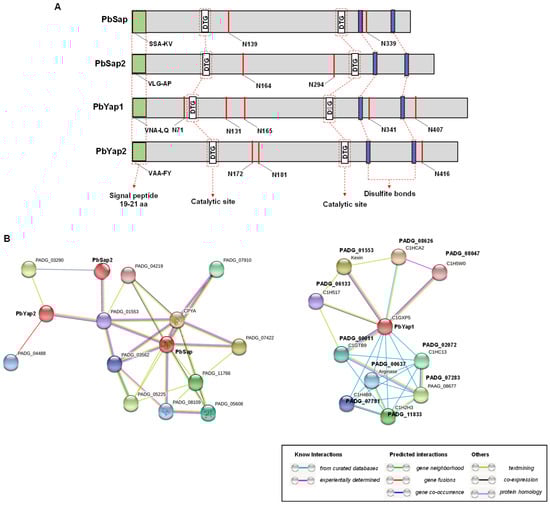 Figure 1. (A) Schematic presentation of aspartic protease of P. brasiliensis. Four encoded genes for aspartic protease were identified in P. brasiliensis: PbSap (PADG_00634), PbSap2 (PADG_03432), PbYap1 (PADG_12056), and PbYap2 (PADG_08282), using the Pep4 sequence of Sacharomyces cerevisiae (YPL154C) as the model. Catalytic sites (DTGSS and D(S/T)GTT) were confirmed using the Pfam database (white box). Signal peptides were identified using the tool SignalIP-5.0 (green box), and the N-glycosilatyon sites were identified through NetNGlyc 1.0 tool (red) and the cysteines (Cys) responsible for disulfide bonds (blue). (B) A typical association network in STRING. The aspartic proteases PbSap (PADG_00364), PbSap2 (PADG_03432), PbYap1 (PADG_12056), and PbYap2 (PADG_08282) from P. brasiliensis have been selected as inputs. The confidence cutoff for showing interaction links has been set to ‘highest’ (0.900).