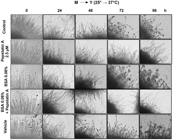 P. brasiliensis yeast cells were reverted to mycelium by incubating cells at 25 °C; the complete transition was followed with microscopy. P. brasiliensis mycelium cells were incubated at 37 °C in the presence or absence of 2.5 µM Pepstatin A, BSA 0.008% (organic nitrogen source), or vehicle and examined via microscopy for up to 96 h. The medium was supplemented with BSA to verify whether this organic nitrogen source could modulate fungal dimorphism. At standard conditions, P. brasiliensis mycelium cells started reverting to yeast form after 24 h of incubation at 37 °C, with a partial transition after 96–120 h (Figure 2). The mycelium cells treated with the vehicle showed a similar transition profile (Figure 2) as the control. Interestingly, when mycelium cells were treated with 2.5 µM Pepstatin A and incubated at 37 °C, there was a delay in the transition to yeast form (Figure 2). However, the presence of BSA 0.008% (Figure 2) or growth in low pH (data not shown) during the M→Y transition did not impact the speed of change. These data demonstrate that Pepstatin A regulates dimorphic switching (M→Y) in P. brasiliensis.