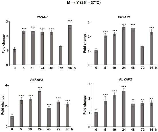 Figure 3. Expression of aspartic protease genes in P. brasiliensis during transition of mycelium to yeast (M→Y). PbSAP (PADG_00634), PbSAP2 (PADG_03432), PbYAP1 (PADG_12056), and PbYAP2 (PADG_08282) transcript levels were measured during the mycelium-to-yeast (M→Y) transition. The change in transcriptional levels was calculated via the 2−ΔΔCt method, with two housekeeping genes (α-TUB and 18S). All of the data shown in this figure were analyzed using ANOVA (analysis of variance) with Dunnet’s post hoc test. Error bars correspond to the standard deviation of measurements performed in triplicate, and asterisks indicate statistically significant differences in expression (** p ≤ 0.01 and *** p ≤ 0.001). The results shown are representative of three independent experiments.