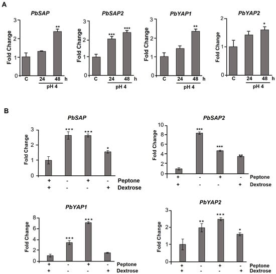 Figure 4. Expression of aspartic protease related genes in P. brasiliensis. (A) PbSAP (PADG_00634), PbSAP2 (PADG_03432), PbYAP1 (PADG_12056), and PbYAP2 (PADG_08282) transcript levels were measured in yeast cells cultivated at a pH of 6.5 or 4 for 24 and 48 h. (B) P. brasiliensis yeast cells were cultivated in a YNB medium in the presence and absence of peptone (2%) and dextrose (2%), and the expression of aspartic protease genes was analyzed. The change in transcriptional levels was calculated via the 2−ΔΔCt method, with two housekeeping genes (α-TUB and 18S). All of the data shown in this figure were analyzed using ANOVA (analysis of variance) with Dunnet’s post hoc test. Error bars correspond to the standard deviation of measurements performed in triplicate, and asterisks indicate statistically significant differences in expression (* p ≤ 0.05, ** p ≤ 0.01 and *** p ≤ 0.001). The results shown are representative of three independent experiments.