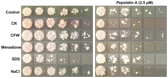 Figure 5. Aspartic proteases modulated the growth of Paracoccidioides brasiliensis cultivated in the presence of different stressors. P. brasiliensis yeast cells (1 × 106 cells) were diluted, plated in a solid mYPD medium containing different agents that disturb the cell wall, oxidative stress, and osmotic stress, such as Calcofluor White (CFW—1 μg/mL), Congo Red (CR—2 μg/mL), Sodium dodecyl sulphate (SDS—0.001%), Menadione (10 μM), and NaCl (150 mM) in the presence or absence of Pepstatina A (2.5 µM). Finally, cells were incubated for seven days at 37 °C. The results shown are representative of three independent experiments.