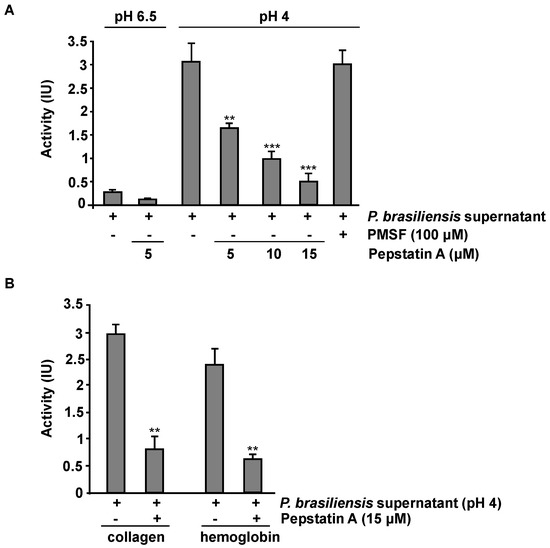 Figure 6. Proteolytic activity profile of secreted acid proteases from P. brasiliensis. (A)Yeast cells were grown in YPDm with a pH of 6.5 or 4 for five days. Proteolytic activity was measured using 20 µL of sample (cell-free supernatant) and 80 µL of 7.5 µM bovine serum albumin (BSA) in 0.1 M citric acid/sodium phosphate, with a pH of 3.3, and incubated at 50 °C. Samples were incubated in the presence or absence of Pepstatin A (5, 10, and 15 μM) or PMSF (100 μM). Then, 20 µL were removed after 30 min and added to 180 µL of Coomassie PlusTM protein assay reagent (Pierce) in a microtiter plate. Absorbance was read at 590 nm, and activity (IU) was calculated relative to BSA degradation using a standard curve. One IU is defined as the degradation of 1 µmol of BSA min−1.mL−1. (B) Samples were incubated with collagen or hemoglobin for 30 min in the presence or absence of Pepstatin A. ** p ≤ 0.01, and *** p ≤ 0.001. The results shown are representative of three independent experiments.