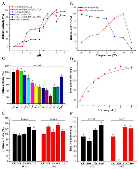Enzyme features of CcMan5C under assay conditions. (A) The pH effect and pH stability of CcMan5C hydrolytic activity toward LBG at 50 °C. (B) The temperature effect and thermostability of CcMan5C hydrolytic activity toward LBG at pH 8.0. (C) Effects of metal ions and EDTA at 1 mM on CcMan5C hydrolytic activity. (D) The effect of LBG concentration on CcMan5C hydrolytic activity. (E) Effects of some organic solvents on CcMan5C hydrolytic activity. CK, control; MT, methyl alcohol; EA, ethyl alcohol; IPA, isopropyl alcohol; CP, acetone. (F) Effects of some detergents on CcMan5C activity toward LBG. CK, control; SDS, sodium dodecyl sulfate; T20, Tween 20; T100, Triton X-100. Data are means ± SDs (n = 3). The data were statistically analyzed by Duncan’s test (p < 0.05). The same letters indicate no significant difference (p > 0.05) and different letters indicate significant differences (p < 0.05) between hydrolytic activities of CcMan5C by Duncan’s test.