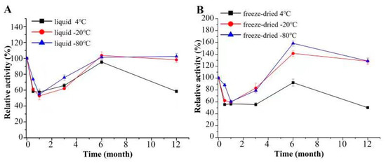 CcMan5C solution or lyophilized CcMan5C was stored at 4 °C, −20 °C, or −80 °C in a refrigerator or freezer for the indicated times and then was used to determine the retained activity compared with the original enzyme sample as described as above.