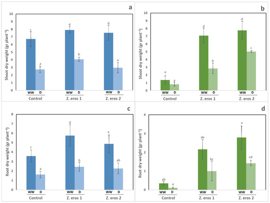 Shoot and root dry weight of wheat plants (a,c) and tomato plants (b,d) inoculated with the fungal endophytes Z. erostrata 1 y Z. erostrata 2 and cultivated under well-watered (WW) and drought stress (D) conditions. The data are the means ± standard deviation of ten replicates. Different letters indicate significant differences between all treatments, according to Duncan’s multiple-range test (p < 0.05).