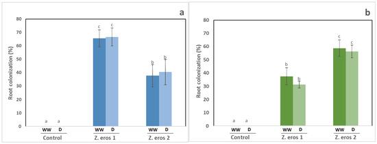 Fungal colonization of plants was not observed in the non-inoculated controls. In addition, no significant differences in the percentage of root colonization were detected between well-watered plants and those subjected to drought stress (see Figure 2a,b). The highest rate of fungal colonization was observed in plants inoculated with strain 1 of Z. erostrata under both watering conditions (≈65%), whereas the plants inoculated with strain 2 of Z. erostrata showed lower levels of colonization (≈35%). However, in tomato plants, the endophyte Z. erostrata 2 exhibited the highest root colonization levels, regardless of the watering conditions applied (see Figure 2a).