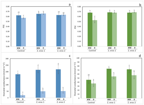 Photosynthetic efficiency (photosystem II) and stomatal conductance in wheat (a,c) and tomato (b,d) plants inoculated with the fungal endophytes Z. erostrata 1 y Z. erostrata 2 and cultivated under well-watered (WW) or drought stress (D) conditions. The data are the means ± standard deviation of four replicates. According to Duncan’s multiple-range test (p < 0.05), different letters indicate significant differences between all treatments.