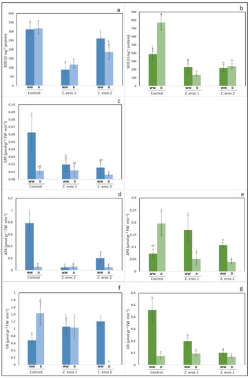 Activities of antioxidant enzymes (SOD, CAT, APX, GR) assayed in shoots of wheat (a,c,d,f) and tomato (b,e,g). Plants were inoculated with the fungal endophytes Z. erostrata 1 y Z. erostrata 2 under well-watered (WW) or to drought (D) conditions. Values represent the means ± standard deviation of four replicates. Significant differences are indicated by different letters above the bars according to Duncan’s multiple-range test (p < 0.05).