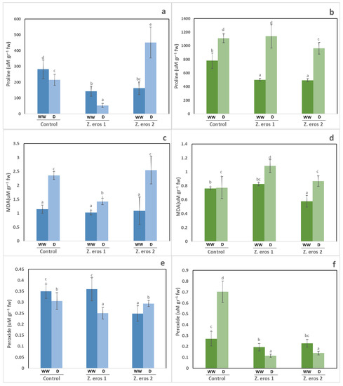 Proline content (a,b), MDA (c,d) and hydrogen peroxide content (e,f) in wheat and tomato plants respectively. Plants were inoculated with the fungal endophytes Z. erostrata 1 y Z. erostrata 2 and cultivated under well-watered (WW) or drought (D) conditions. Values are the means ± standard deviation of four replications. According to Duncan’s multiple-range test (p < 0.05), different letters indicate significant differences between all treatments.