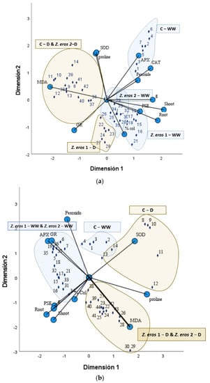 The data were analyzed by one-way ANOVAs using INFOSTAT software [65]. When significant differences were identified by ANOVA (p < 0.05), Duncan’s multiple range test for means comparison was applied [66]. Nonlinear principal component analysis (CATPCA) was used to determine the relation between the variables measured and the different treatments studied. We tested whether the growth variables of the plants (root dry weight, shoot dry weight, photosynthetic efficiency and stomatal conductance), antioxidant enzyme activities (SOD, CAT, APX and GR) and other biochemistry parameters (proline, MDA and hydrogen peroxide concentrations) differed among the six treatments evaluated (well-watered conditions, drought stress, fungal inoculation with Z. erostrata 1 y Z. erostrata 2).