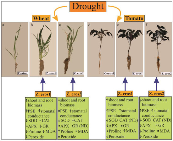 Effects triggered by two endophytic fungal strains (Z. erostrata 1 and Z. erostrata 2) to alleviate drought stress in wheat and tomato plants. Wheat plants (a–c) and tomato plants (d–f), uninoculated controls and plants inoculated with the fungal endophytes Z. erostrata 1 y Z. erostrata 2 subjected to drought stress conditions. ↑ arrows show an increase, while ↓ arrows show a decrease in the variable. The sign = indicates no significant changes in the parameter, and ND: indicates not detected.