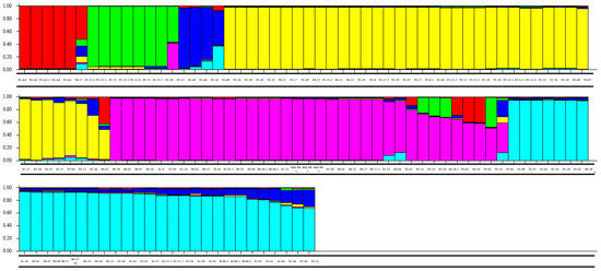 - Pritchard, J.K.; Stephens, M.; Donnelly, P. Inference of population structure using multi locus genotype data. Genetics 2000, 155, 945–959. [Google Scholar] [CrossRef] [PubMed]