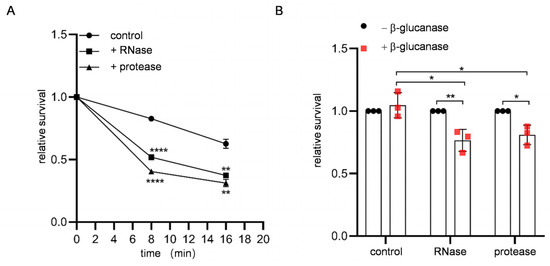 Stress sensitivities of spores treated with RNase or protease. (A) Spores treated with or without (control) RNase or protease were incubated with ether solution for the indicated times and plated on rich media, and colony numbers were counted. For each assay, the number of colonies obtained at 0 min (without ether treatment) was determined as 1, and the relative viability is shown. (B) Spores treated with or without (control) protease or RNase were treated with or without β-glucanase for 2 h at 37 °C and plated on rich media, and colony numbers were counted. Data are presented as the mean ± SEM. Statistical significance was determined by two-tailed unpaired Student’s t-tests. n = 3. *, p < 0.05; **, p < 0.01; ****, p < 0.0001.