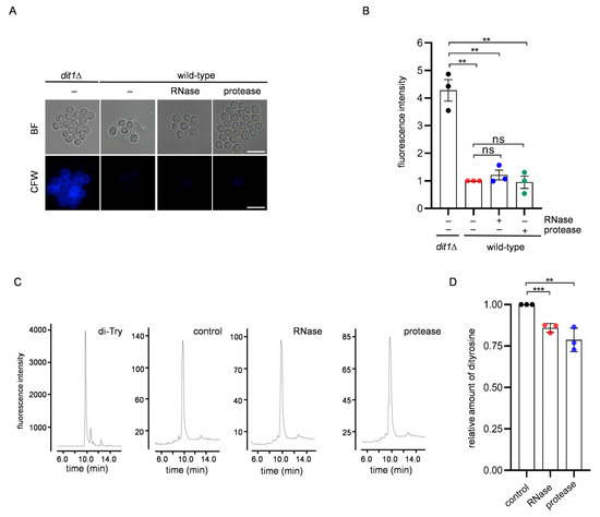 RNA bound to the spore wall was significantly decreased in the dityrosine layer-defective mutant dit1Δ [9]. Thus, the machinery to accommodate RNA is linked to the dityrosine layer. To analyze whether the dityrosine layer is compromised by protease or RNase treatments, a calcofluor white (CFW)-staining assay was performed. Because the dityrosine layer prevents the binding of CFW to chitosan in the spore wall, the integrity of the dityrosine layer can be analyzed by CFW staining [14]; for example, dit1Δ spores are stained by CFW (Figure 2A,B). However, the protease- or RNase-treated spores were not stained by CFW (Figure 2A,B). This result suggests that the dityrosine layer is not abrogated by these treatments. To further assess the effect of the treatments on the dityrosine layer, the levels of dityrosine in the spores were measured. In the protease- and RNase-treated spores, dityrosine levels were decreased by 21% and 15%, respectively (Figure 2C,D). Thus, dityrosine molecules were slightly removed by protease or RNase treatment. Nevertheless, most dityrosine molecules were impervious to protease and RNase treatment.