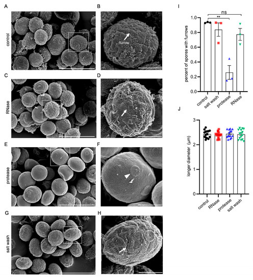 FESEM analysis of the surface morphology of spores. (A) Untreated control. (C,E,G) RNase-, protease-, or salt washed spores, respectively. (B,D,F,H) Close-up of the boxed areas in (A,C,E,G), respectively. (A,C,E,G) Scale bar, 5 µm. (B,D,F,H) Scale bar, 1 µm. Arrows in (B,D,H) indicate furrows. The arrowhead in (F) indicates a probable interspore bridge scar. (I) Quantification of spores with furrows. (J) Analysis of the longer diameters of spores. Data are presented as the mean ± SEM. Statistical significance was determined by two-tailed unpaired Student’s t-tests. n = 3 (I), n = 15 (J); **, p < 0.01; ns, not significant (p ≥ 0.05).