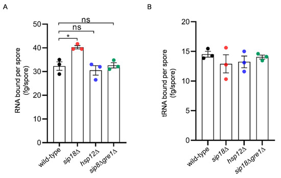 Analysis of the ability of hydrophilin mutant spores to hold RNA. (A) Amount of RNA eluted from 2 × 108 wild-type, sip18Δ, sip18Δgre1Δ, or hsp12Δ spores. (B) Amounts of tRNA bound to high-salt-washed wild-type sip18Δ, sip18Δgre1Δ or hsp12Δ spores. A total of 2 × 108 spores were incubated with 40 µg of tRNA. Data are presented as the mean ± SEM. Statistical significance was determined by two-tailed unpaired Student’s t-tests. n = 3. *, p < 0.05; ns, not significant (p ≥ 0.05).