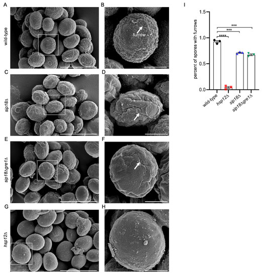 FESEM analysis of hydrophilin mutant spores. (A,C,E,G) Wild-type sip18Δ, sip18Δgre1Δ, and hsp12Δ spores, respectively. (B,D,F,H) Close-up of the boxed areas in (A,C,E,G), respectively. (A,C,E,G) Scale bar, 5 µm. (B,D,F,H) Scale bar, 1 µm. Arrows indicate furrows. (I) Quantification of spores with furrows. Data are presented as the mean ± SEM. Statistical significance was determined by two-tailed unpaired Student’s t-tests. n = 3 (I). ***, p < 0.001; ****, p < 0.0001.