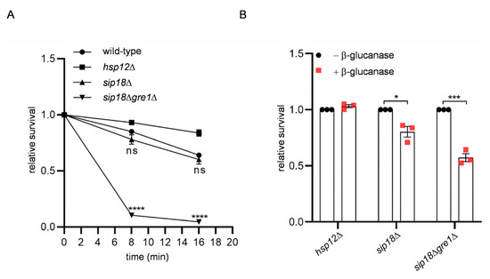 Stress sensitivity of hydrophilin mutant spores. (A) The indicated spores incubated with ether solution for the indicated times were plated on rich media, and colony numbers were counted. For each assay, the number of colonies obtained at 0 min (without ether treatment) were determined as 1, and the relative viability is shown. (B) The indicated spores treated with or without β-glucanase for 2 h at 37 °C were plated on rich media, and colony numbers were counted. Data are presented as the mean ± SEM. Statistical significance was determined by two-tailed unpaired Student’s t-tests. n = 3. *, p < 0.05; ***, p < 0.001; ****, p < 0.0001; ns, not significant (p ≥ 0.05).