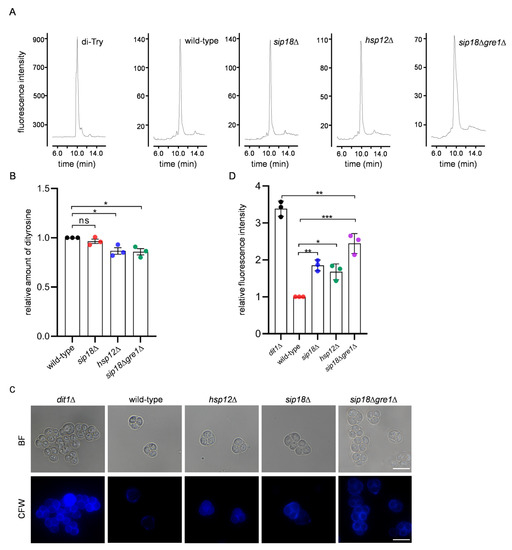 CFW staining assay of hydrophilin mutant spores. (A) Lysates of mutant spores were hydrolyzed with 6 N HCl and subjected to HPLC analysis. Synthesized dityrosine (di-Tyr) was assayed as a control. (B) The relative amount of dityrosine detected by HPLC described in (A). The dityrosine peak detected in the control sample was defined as 1. (C) The dit1Δ and wild-type sip18Δ, sip18Δgre1Δ or hsp12Δ spores were stained with CFW and observed under fluorescence (CFW) or bright field (BF) microscopy. Scale bar, 5 µm. (D) Quantification of the fluorescence intensities of CFW of the indicated spores. Data are presented as the mean ± SEM. Statistical significance was determined by two-tailed unpaired Student’s t-tests. n = 3. *, p < 0.05; **, p < 0.01; ***, p < 0.001; ns, not significant (p ≥ 0.05).