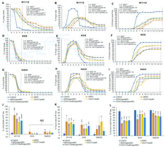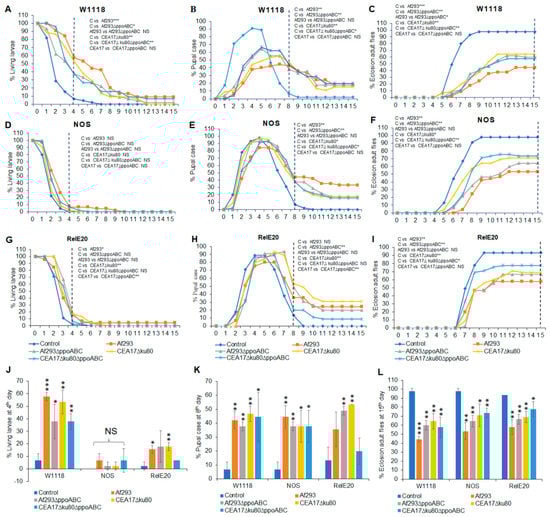 Figure 2. Effects of VOCs emitted from four different A. fumigatus strains pre−grown on PDA at 37 °C for 3 days on the third instar white−eyed fly larvae over 15 days of continuous exposure. The percentages of living larvae, pupal case, and eclosion adult flies are as follows: w1118 living larvae (A), NOS larvae (D), and RelE20 larvae (G); w1118 pupal case (B), NOS pupal case (E), and RelE20 pupal case (H); and w1118 eclosion adult flies (C), NOS eclosion adult flies (F), and RelE20 eclosion adult flies (I). The statistical analyses were performed for the living larvae on the 4th day (J), the pupal case on the 8th day (K), and the eclosion adult flies on the 15th day (L). A dashed vertical line denotes the days for statistical analysis (N = 180). * Represents the significant differences between different treatments, where 0.005 < * p < 0.05, 0.0005 < ** p < 0.005, *** p < 0.0005; NS, p > 0.05.