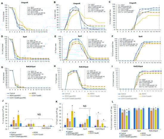 Figure 3. Effects of VOCs emitted from four different A. fumigatus strains pre−grown on PDA at 25 °C for 5 days on the third instar red−eyed fly larvae over 15 days of continuous exposure. The percentages of living larvae, pupal case, and eclosion adult flies are as follows: OregonR living larvae (A), Spz6 larvae (D), and RelE20Spz4 larvae (G); OregonR pupal case (B), Spz6 pupal case (E), and RelE20Spz4 pupal case (H); and OregonR eclosion adult flies (C), Spz6 eclosion adult flies (F), and RelE20Spz4eclosion adult flies (I). The statistical analyses were performed for the living larvae on the 4th day (J), the pupal case on the 8th day (K), and the eclosion adult flies on the 15th day (L). A dashed vertical line denotes the days for statistical analysis (N = 180). * Represents the significant differences between different treatments, where 0.005 < * p < 0.05, 0.0005 < ** p < 0.005; NS, p > 0.05.