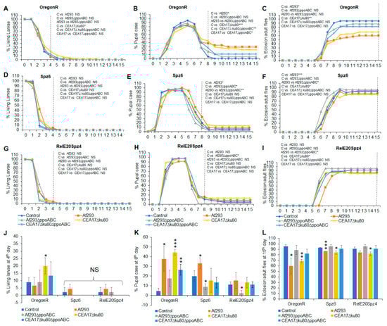 Figure 4. Effects of VOCs emitted from four different A. fumigatus strains pre−grown on PDA at 37 °C for 3 days on the third instar red−eye fly larvae over 15 days of continuous exposure. The percentages of living larvae, pupal case, and eclosion adult flies are as follows: OregonR living larvae (A), Spz6 larvae (D), and RelE20Spz4 larvae (G); OregonR pupal case (B), Spz6 pupal case (E), and RelE20Spz4 pupal case (H); and OregonR eclosion adult flies (C), Spz6 eclosion adult flies (F), and RelE20Spz4 eclosion adult flies (I). The statistical analyses are performed for the living larvae on the 4th day (J), the pupal case on the 8th day (K), and the eclosion adult flies on the 15th day (L). A dashed vertical line denotes the days for statistical analysis (N = 180). * Represents the significant differences between different treatments, where 0.005 < * p < 0.05, 0.0005 < ** p < 0.005, *** p < 0.0005; NS, p > 0.05.