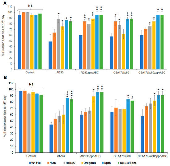 Figure 5. Comparative analyses of the white−eyed and red−eyed Drosophila male adults exposed to VOCs emitted from four different A. fumigatus strains. Percentages of eclosion adult flies exposed to VOCs emitted by Af293, Af293∆ppoABC, CEA17∆ku80, and CEA17∆ku80ppoABC pre−grown at 25 °C for 5 days are shown in (A); at 37 °C for 3 days are shown in (B). * Represents the significant differences between different treatments, where 0.005 < * p < 0.05, 0.0005 < ** p < 0.005, *** p < 0.0005; NS, p > 0.05.