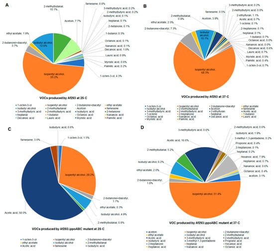 Figure 6. VOCs profiles produced by Af293 and Af293∆ppoABC strains. VOCs produced by Af293 pre−grown at 25 °C for 5 days are shown in (A); VOCs produced by Af293 pre−grown at 37 °C for 3 days are shown in (B); VOCs produced by Af293∆ppoABC pre−grown at 25 °C for 5 days are shown in (C); and VOCs produced by Af293∆ppoABC pre-grown at 37°C for 3 days are shown in (D).