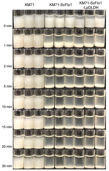 Figure 1. The flocculation phenotypes of engineered strains generated in this study. P. pastoris KM71, KM71-ScFlo1, and KM71-ScFlo1-LpDLDH were cultivated in MGYH-glu medium overnight at 30 °C at 250 rpm. One milliliter aliquots of the overnight cultures were transferred to 1.5 mL glass vials. The experiments were performed in biological triplicate.