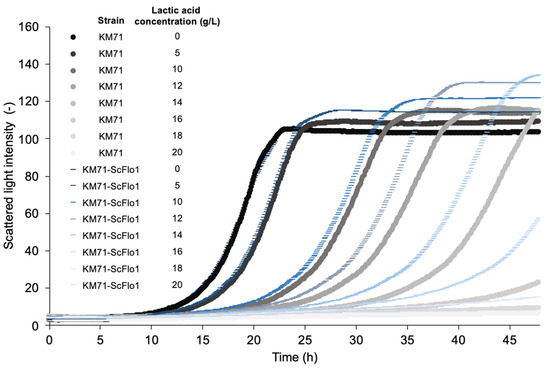 Figure 2. Effects of various lactic acid concentrations in YPD medium (liquid culture) on the growth of P. pastoris with or without ScFlo1 overexpression. P. pastoris KM71 and KM71-ScFlo1 were cultivated in YPD medium with different concentrations (0, 5, 10, 12, 14, 16, 18, and 20 g/L) of lactic acid in a microflower plate. The cells were grown in the BioLector microfermenter (m2p labs) at 30 °C at 1100 rpm with 70% humidity for 48 h. Plates were sealed with porous film to minimize evaporation. The experiments were performed in biological triplicate.