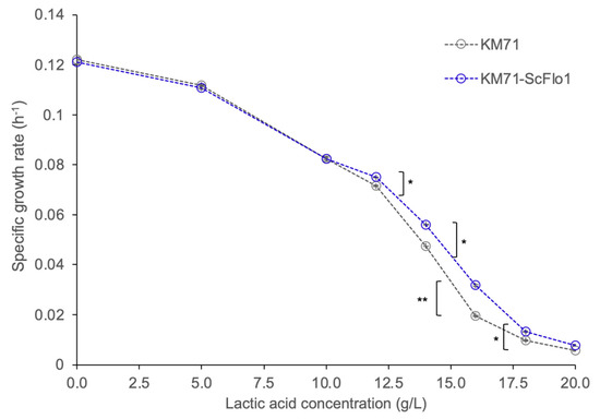 Figure 3. Effects of various lactic acid concentrations in YPD medium (liquid culture) on specific growth rates of P. pastoris with or without ScFLO1 overexpression. Results are the mean of three biological replicates (n = 3). Error bars represent the standard deviation from three replicate experiments. * p < 0.05, ** p < 0.01, two-tail, unpaired, heteroscedastic Student’s t-test.
