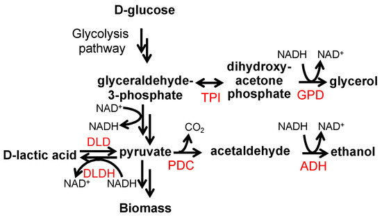 Figure 4. Production of d-lactic acid from glucose. The expression of a d-lactate dehydrogenase (DLDH) enzyme from lactic acid bacteria results in the production of d-lactic acid from pyruvate. By decreasing the production of ethanol and glycerol and limiting the degradation of d-lactic acid, the amount and yield of d-lactic acid can be increased. DLDH, lactic acid bacteria d-lactate dehydrogenase; DLD, endogenous d-lactate dehydrogenase; ADH, alcohol dehydrogenases; PDC, pyruvate decarboxylase; TPI, triosephosphate isomerase; and GPD, glycerol-3-phosphate dehydrogenases.