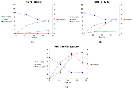 Figure 5. d-lactic acid production in the engineered P. pastoris strains: KM71 (control) (A), KM71-LpDLDH (B), and KM71-ScFlo1-LpDLDH (C). Values represent the mean of three biological replicates ± standard deviation (n = 3).