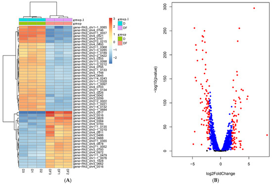 Figure 6. Gene expression heatmap (A) and a volcano plot (B) of d-lactic acid-producing Pichia pastoris with (DF1-3) or without (D1-3) ScFLO1 overexpression.