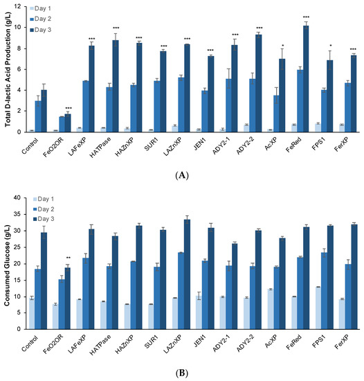 Figure 7. Overexpression of several DE genes improved the production of d-lactic acid. d-lactic acid production (A) and glucose consumption (B) of engineered P. pastoris strains overexpressing selected DE genes identified. Results are the mean of three biological replicates (n = 3). Error bars represent the standard deviation. * p < 0.05, ** p < 0.01, *** p < 0.001, two-tail, unpaired, heteroscedastic Student’s t-test. Statistical significance is shown for Day 3 results relative to control.