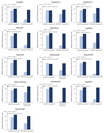 Figure 8. RT-PCR analysis of selected DE genes including PpJEN1, PpADY2-1, PpADY2-2, PpFeRed, PpAcXP, PpLAZnXp, PpHAZnXP, PpFPS1, PpFerXP, PpSUR1, PpH+ATPase, PpFeO2OR, PpLAFeXp, and LpDLDH in engineered yeast. Real-time PCR was performed in three biological replicates. Values represent the mean of three biological replicates ± standard deviation (n = 3).