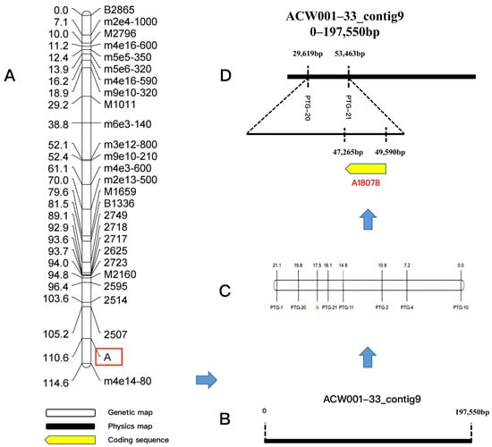 Fine mapping of the color control locus and candidate genes. (A): Preliminary location linkage map of the color control locus, in the figure, A is the color control loci; (B): Physical map of ACW001–33_contig9; (C): Fine mapping linkage map of the color control locus by PTG-specific primers; (D): Location of the color control locus in the ACW001–33 genome and prediction of functional genes in this region.